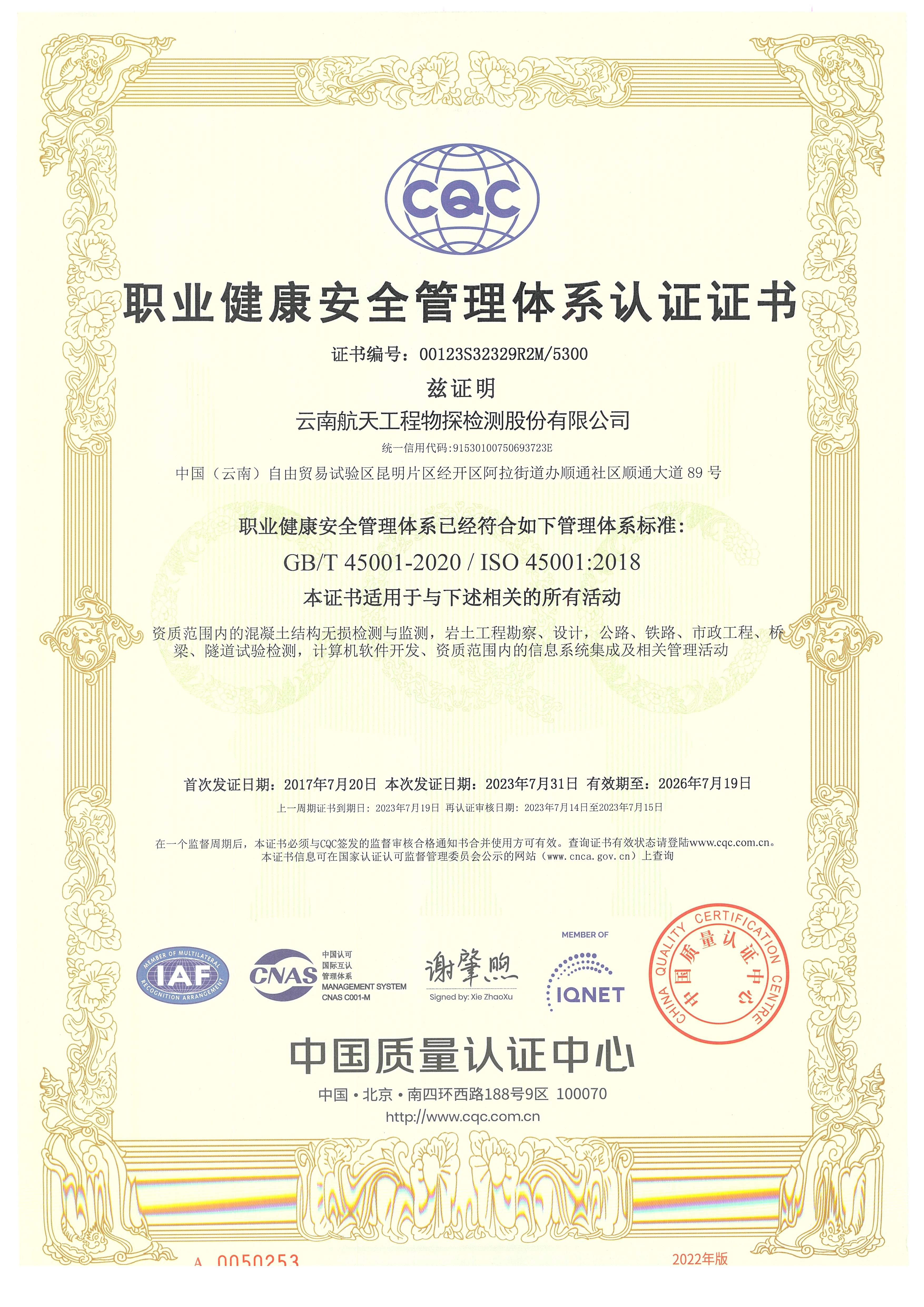職業(yè)健康安全管理體系認證證書